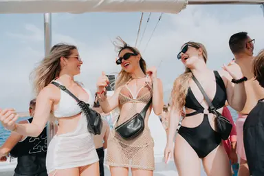 Ensuite, direction notre bateau, le plus mythique des navires événementiels des Baléares. L'ambiance est un peu plus calme au départ, lorsque nous quittons le port. Mais dès que vous aurez pris vos premiers verres, que la musique commencera et que les autres invités se détendront, nous vous garantissons un après-midi fantastique.